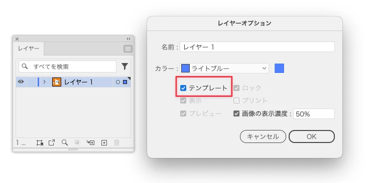 Illustratorには、レイヤー自体を薄く表示させる&プリント時に含めないようにする、という機能があり、ややこしいのですが「テンプレート」と言います。Illustratorファイルのテンプレートとは別です。