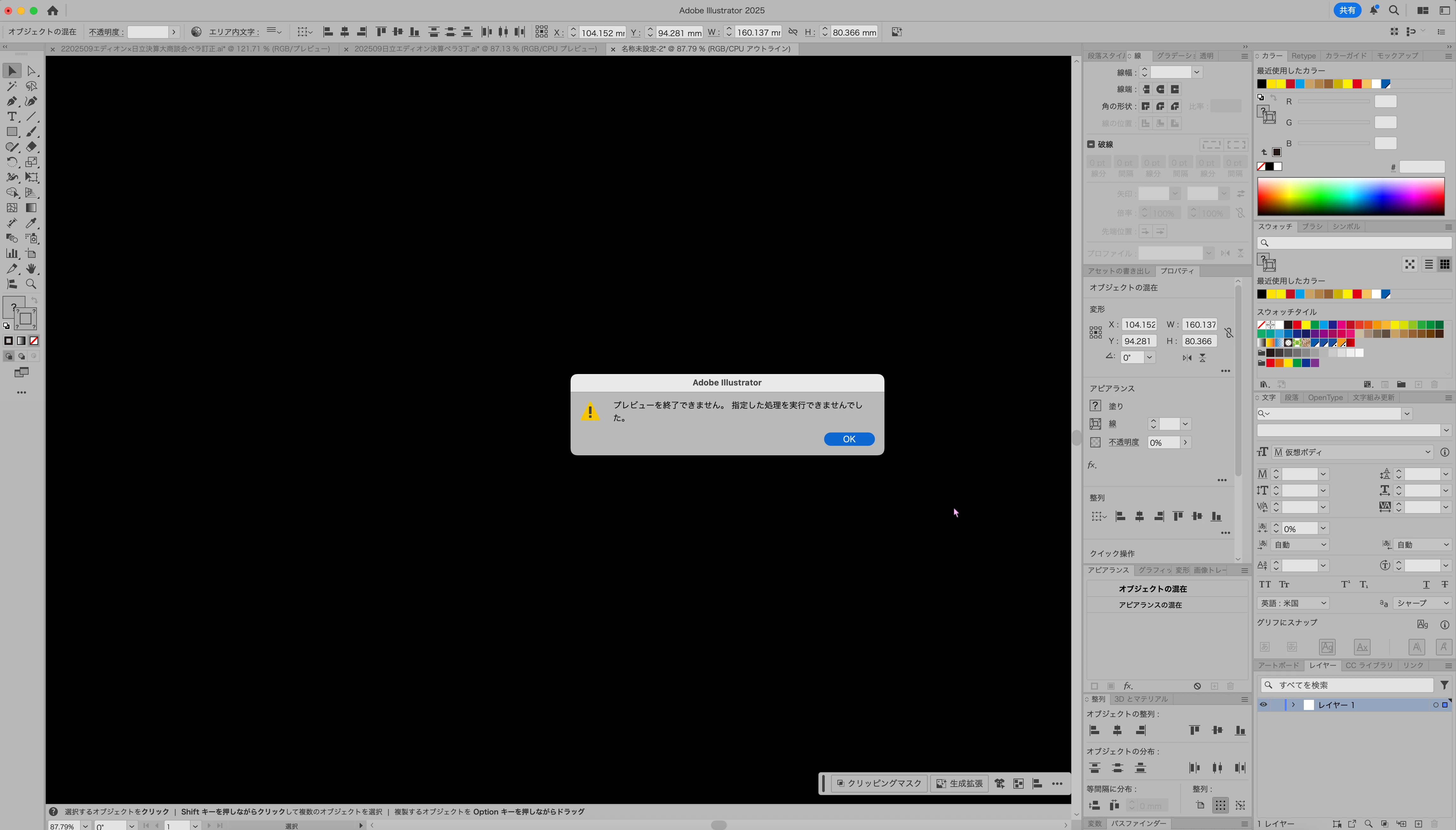 現時点では明確な回答は難しい状況ですが、「プレビューを終了できません。指定して処理を実行できませんでした。」と表示される場合、主に以下のような原因が考えられます。