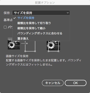 リンク配置したファイルのサイズについては、リンクパネルの右上のメニューから「配置オプション...」にて設定できます。どういう挙動になるかわかるよう説明のついたダイアログになっていますので、期待する挙動のものを選んでください。