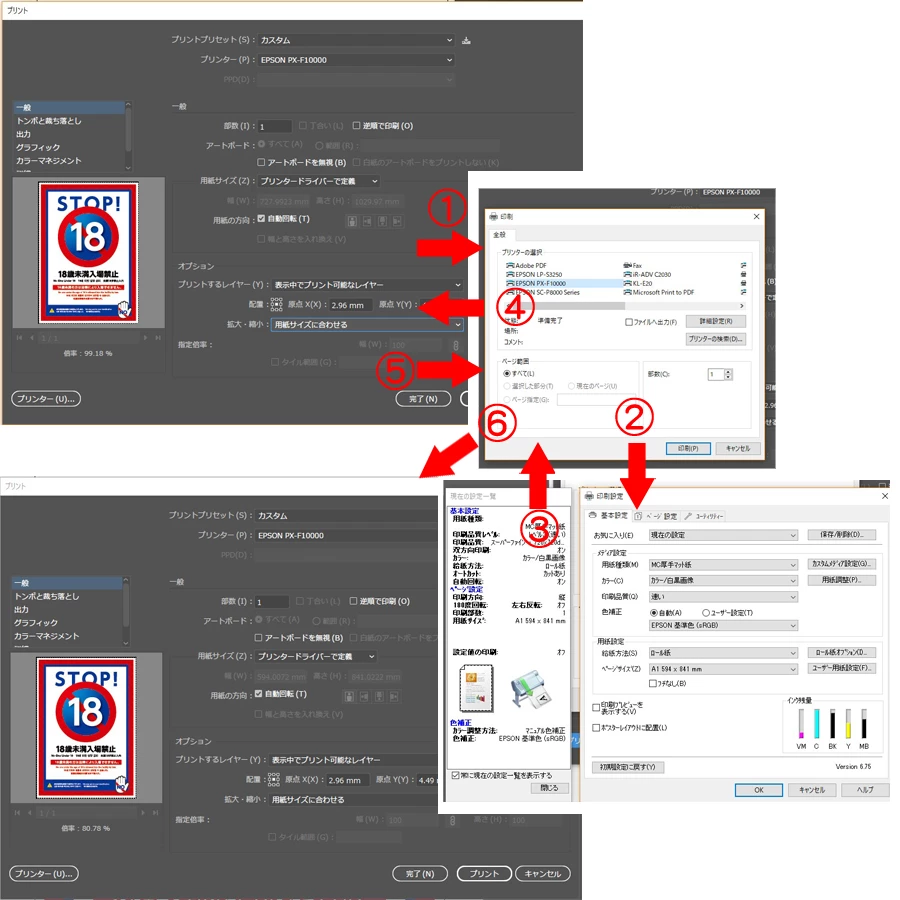 また、プリンタードライバーで設定する理由ですが、出力の際は紙のサイズの設定だけでなく、フチ無しフチ有りの設定や、用紙の種類が数種類あり、出力するデータによって変更する必要があります。また、ロール紙、単票紙の設定もEPSONの詳細設定で行い、印刷を掛けています。ですので、ほぼ毎回詳細設定を開く必要があるのです。