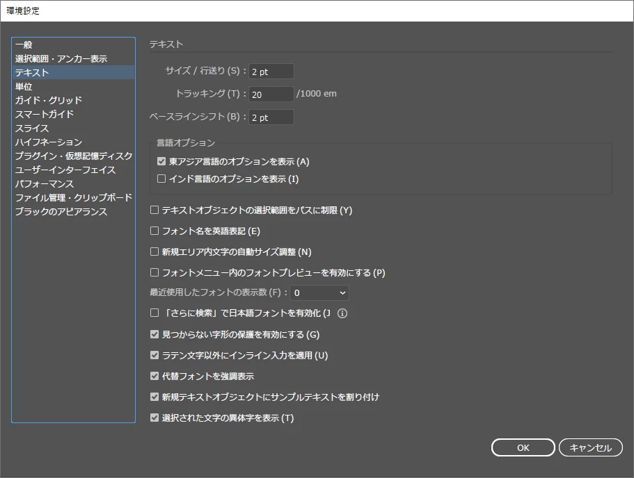 これがOFFの場合は日本語組版まわりの設定は表示されません。