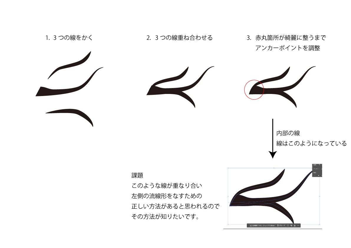 上記方法ですが、画像のように最も左側の三本の線を一箇所にまとめる方法はどのようにしたらできるのでしょうか。(オープンパスのアンカーポイントからクリックして新たな線を描く方法)