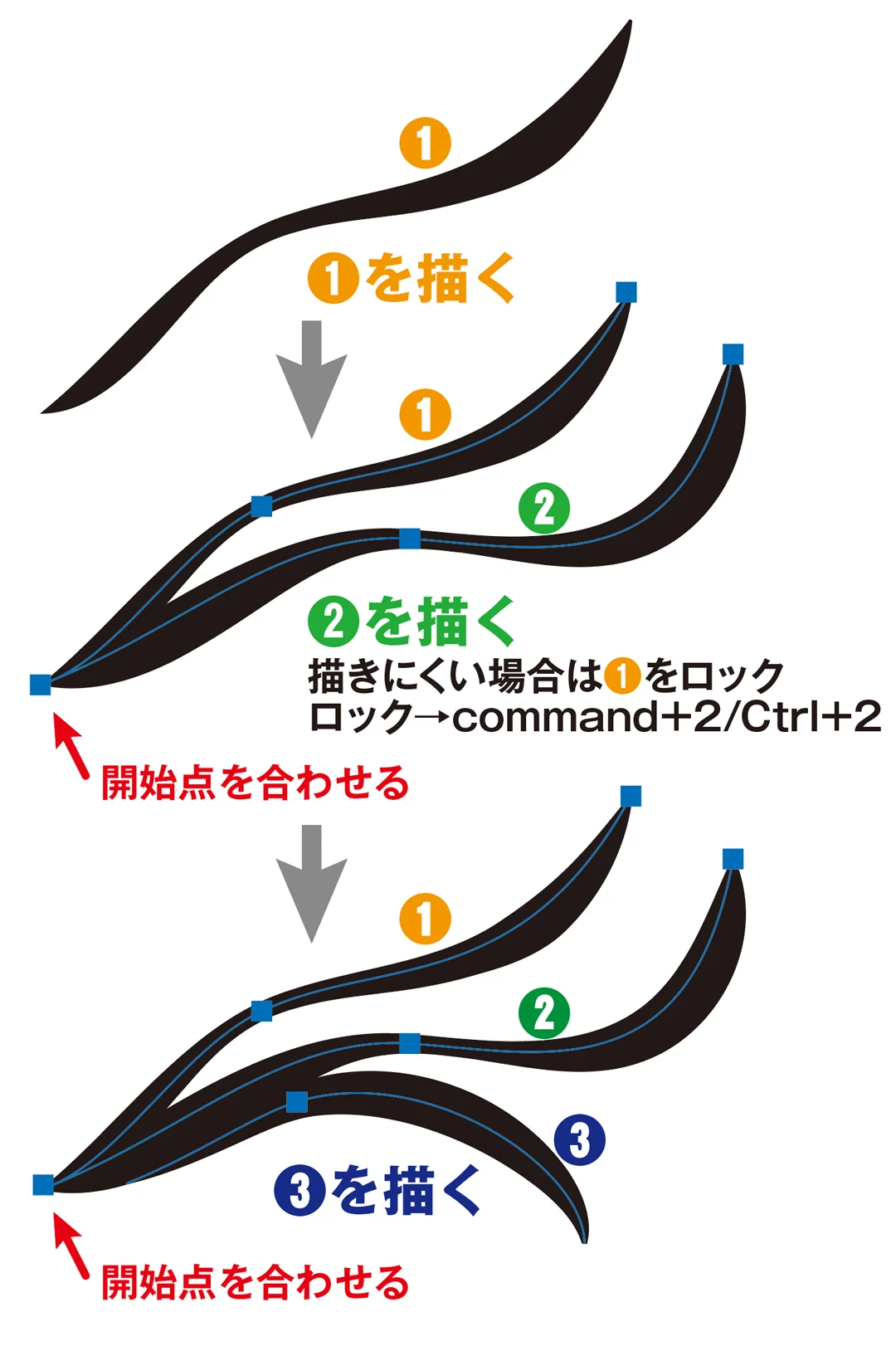 一本ずつ別々にパスで描き、端のアンカーポイントを一箇所に集めます。