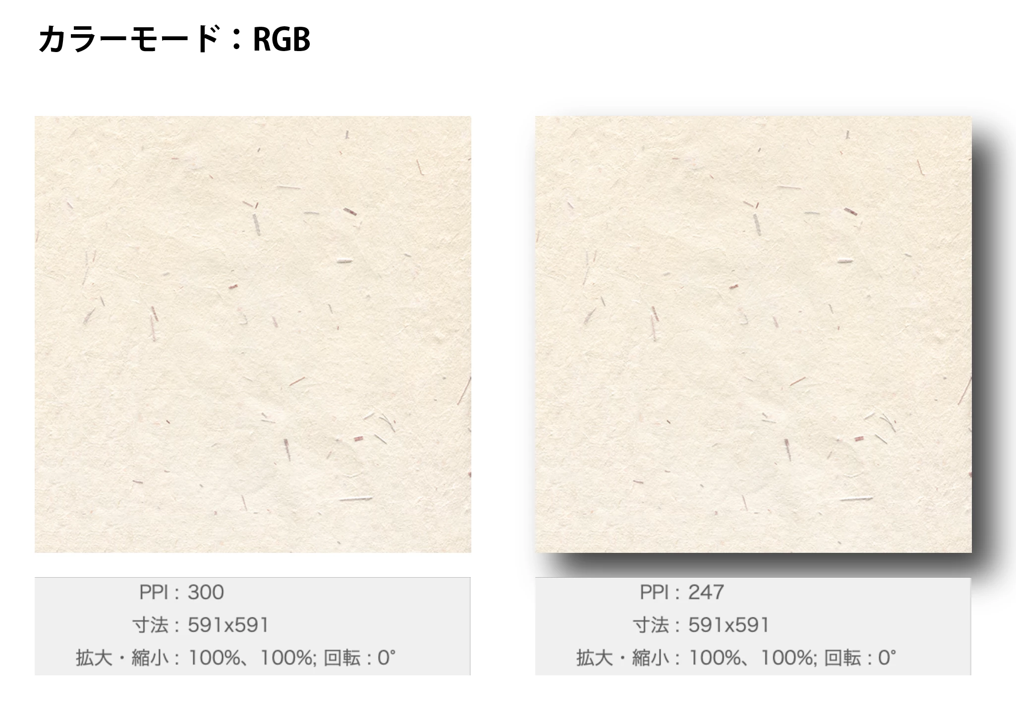 「50mm×50mm 300ppi」の配置画像にアピアランスの「ドロップシャドウ」をつけると、リンクパネル上のPPIが300→247に変わってしまいます。(CMYKカラーでは247×247、RGBカラーでは247と表記されています)