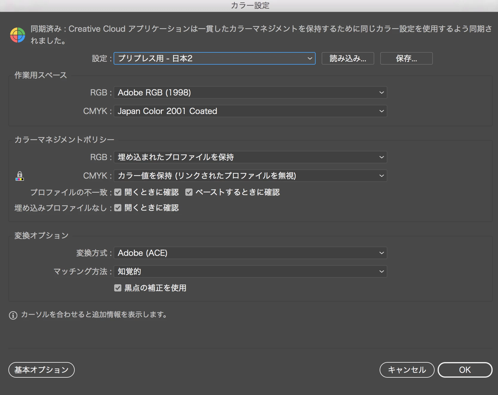 ちなみに私のカラー設定は「プリプレス用日本2」です。