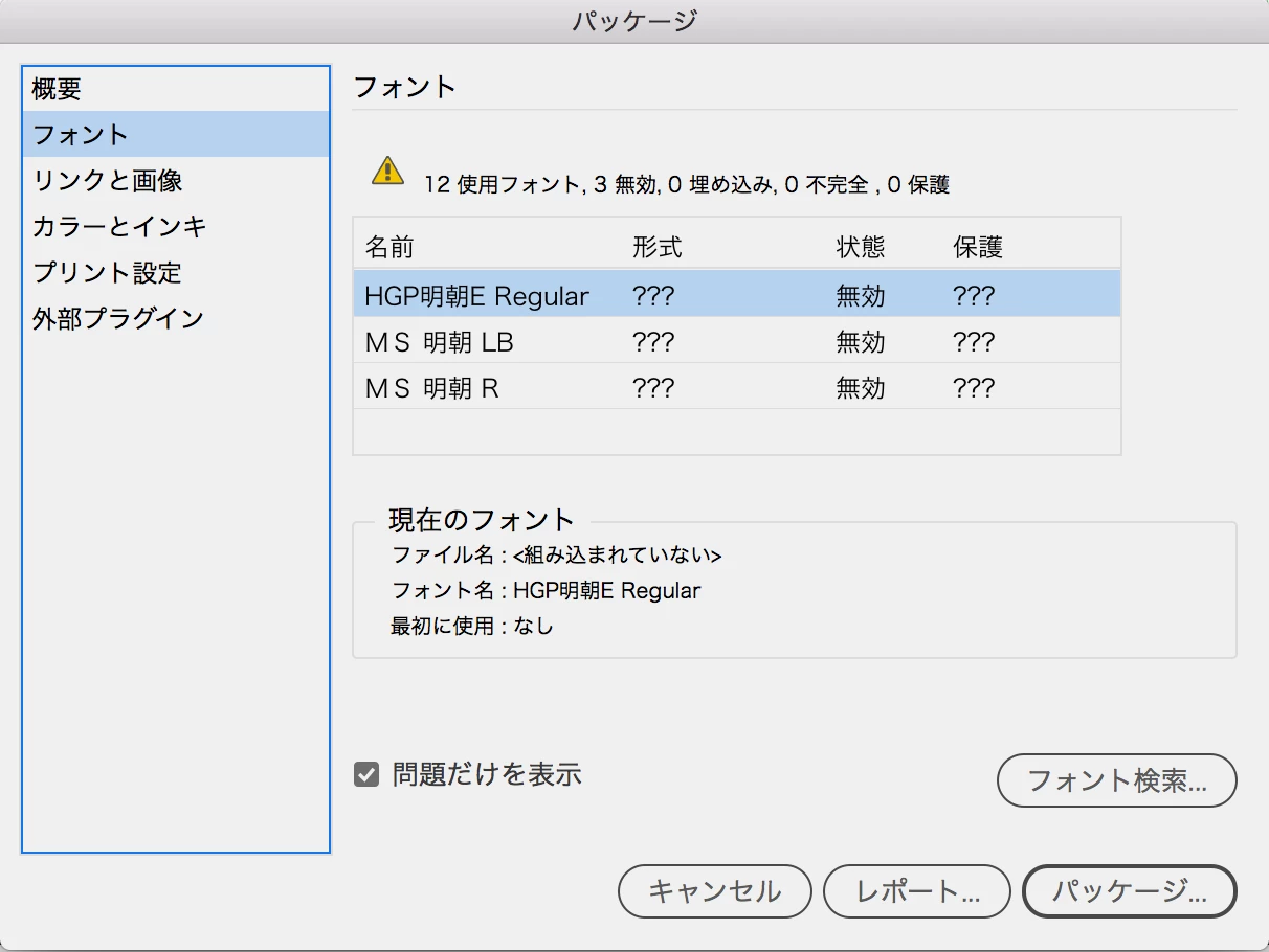 パッケージする際、使用していないフォントが無効とエラーの表示がでます。