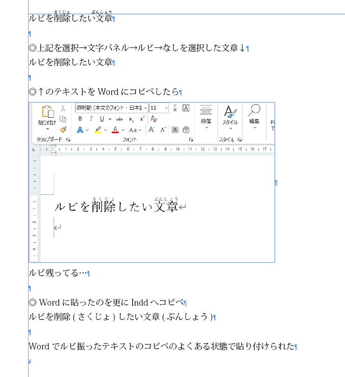 Indesign上の文字パネルからルビ→なしを選択して、Indesign上では一見ルビが見えなくなりましたが、Wordや内部タグが見れる物にコピーした場合、ルビが残っているのがわかりました。