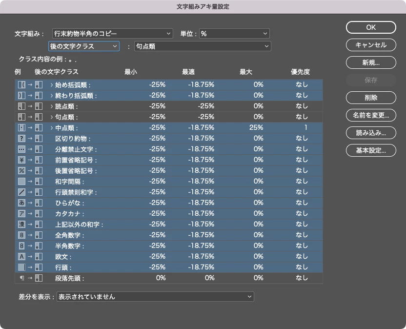 各行の文字を整列させるために必要な句読点の設定について