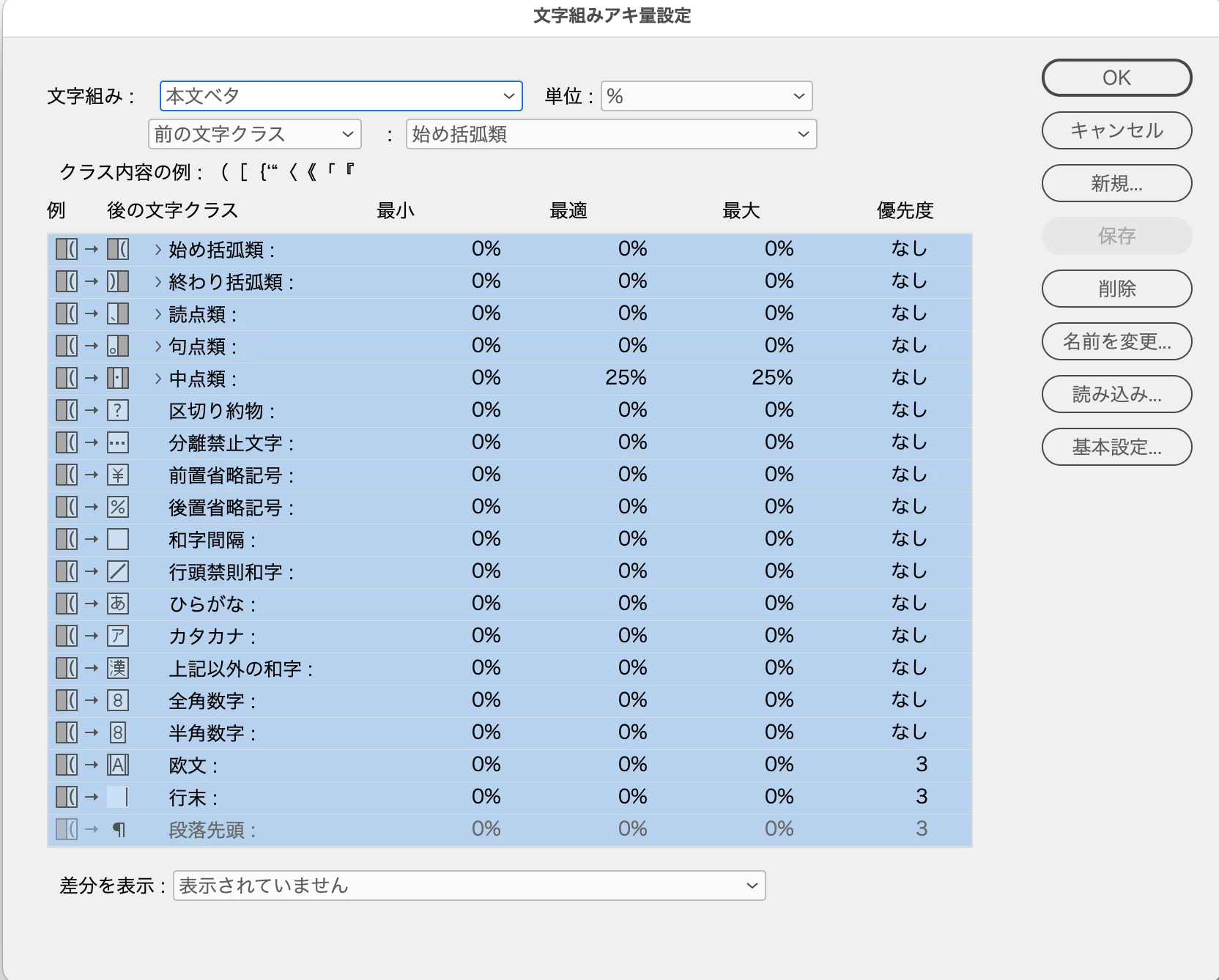 文字組みアキ量設定で、全部まとめて数値を変更しようとして全項目を選択すると、