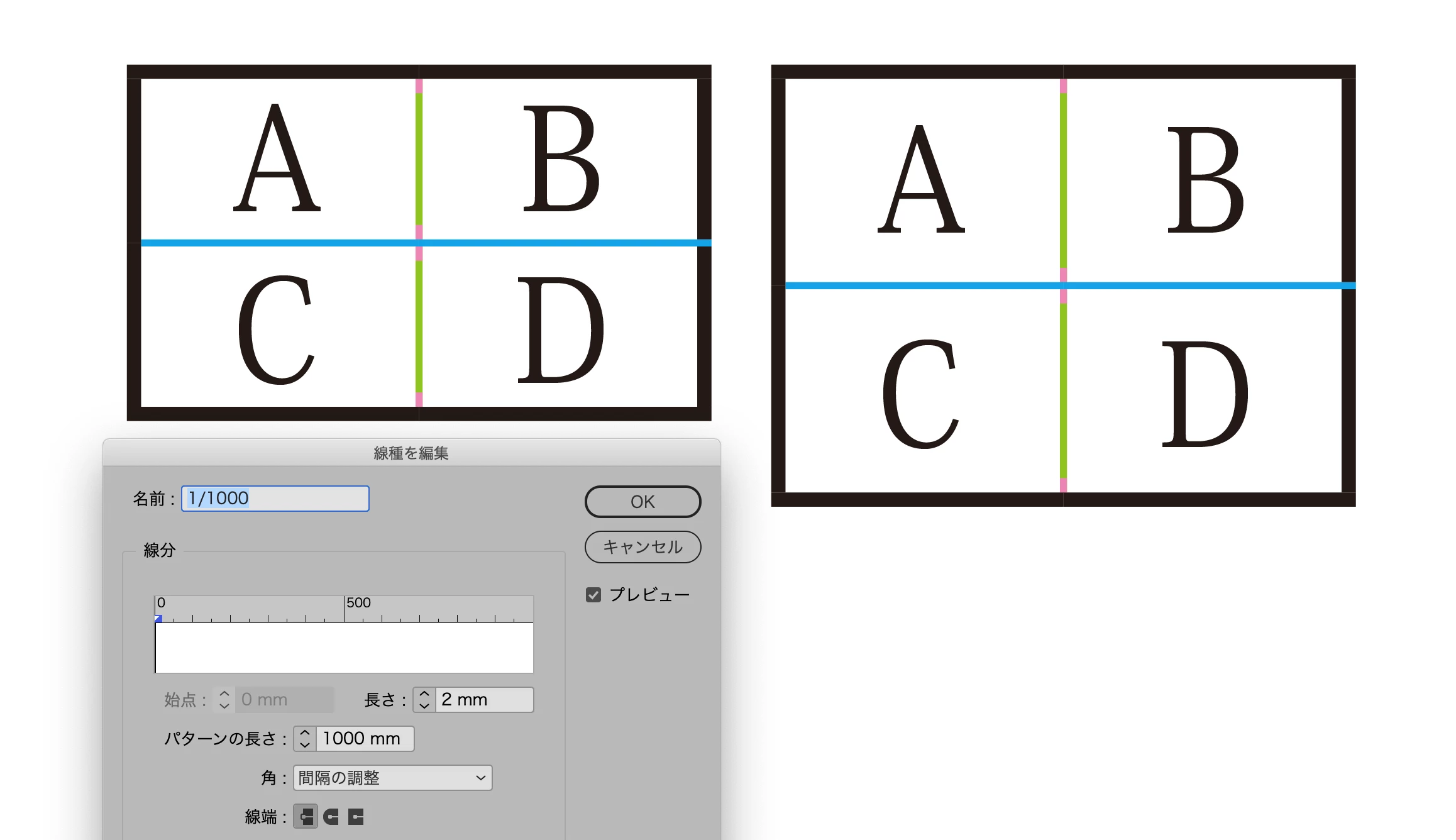 長さ2mm、パターンの長さ1000mm、角:間隔の調整