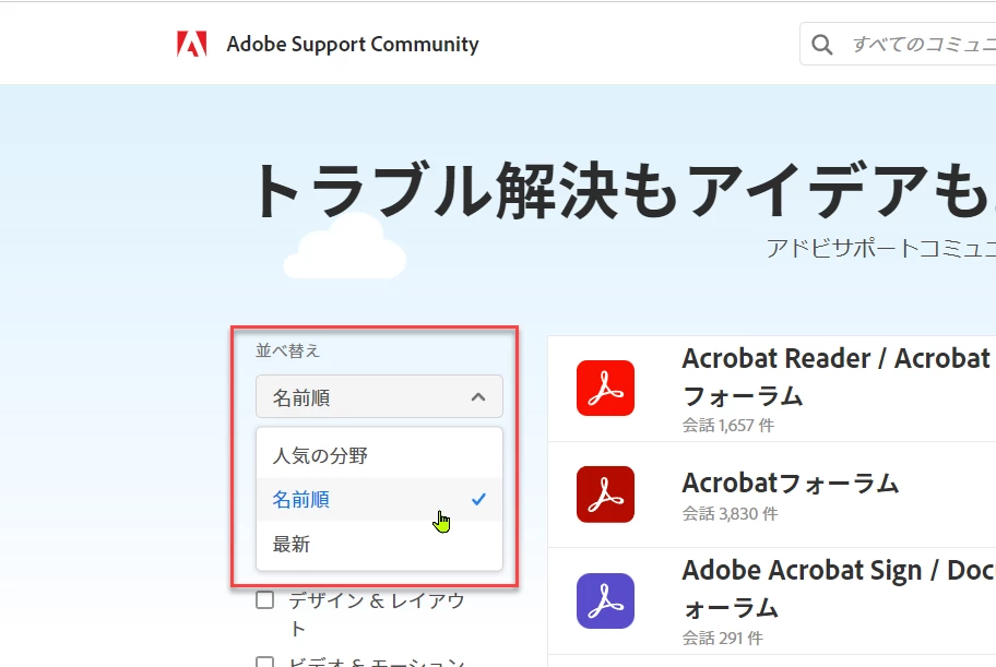 推測ですが、Adobe Support Communityのトップページの一覧に、それぞれのフォーラムがないということでしょうか?