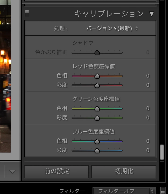 Lightroom Classicのキャリブレーションにあるシャドウ(色かぶり補正)がグレーアウトしてしまい使用できません。
