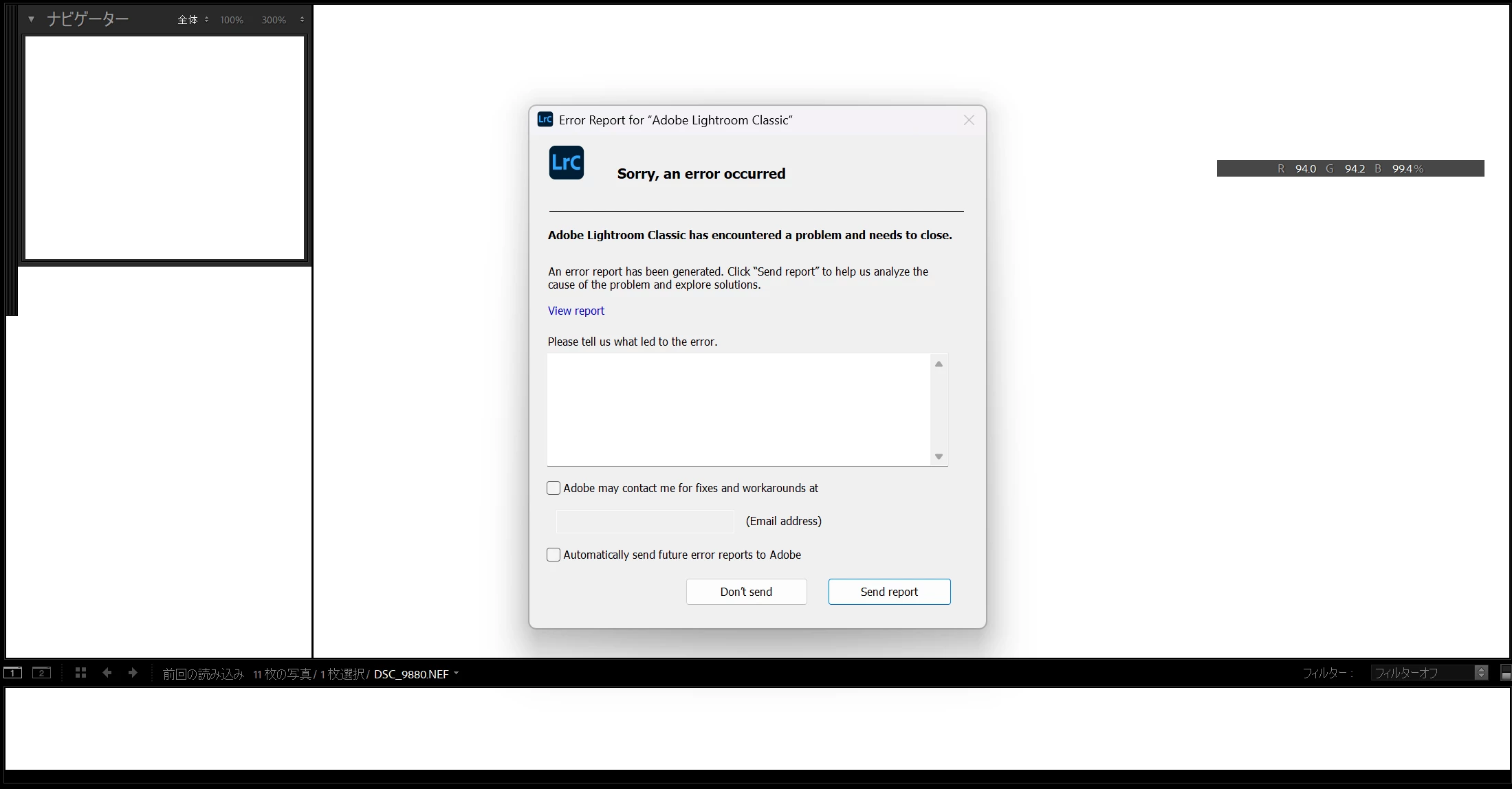 連続してノイズ除去をすると画像のようにエラーが表示されて毎回強制終了となります。