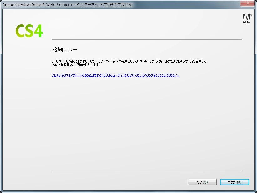 「接続エラー アドビサーバに接続できませんでした。インターネット接続が有効になっていないか、ファイアウォールまたはプロキシサーバを使用していることが原因である可能性があります。」
