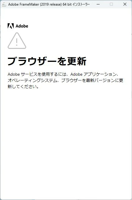 FrameMaker2019をインストールしようとSet-up.exeを起動すると「ブラウザーを更新」と表示され、先へ進むことができません。