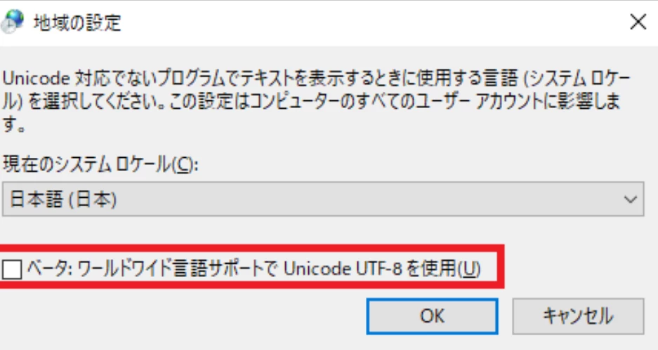 ワールドワイド言語サポートで Unicode UTF-8 を使用のチェックを外す