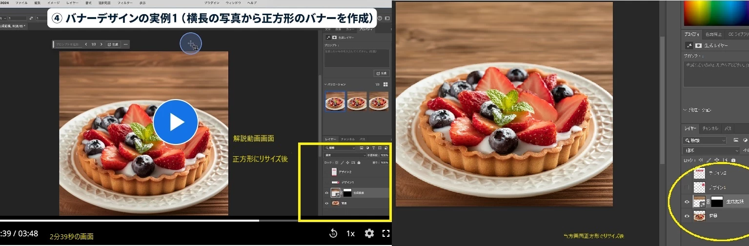 左画面黄色の四角で囲った部分が解説動画のレイヤーの表示で、右画面黄色の○で囲った部分が当方の作業画面です。解説動画の方はリサイズをしてもレイヤーのデザイン1,デザイン2の形は変わらないのに対して当方のは変わっています。この時点でデザイン2のほうは長方形の形に合わせたデザインが、正四角形に切り取られた形になってしまっていました。