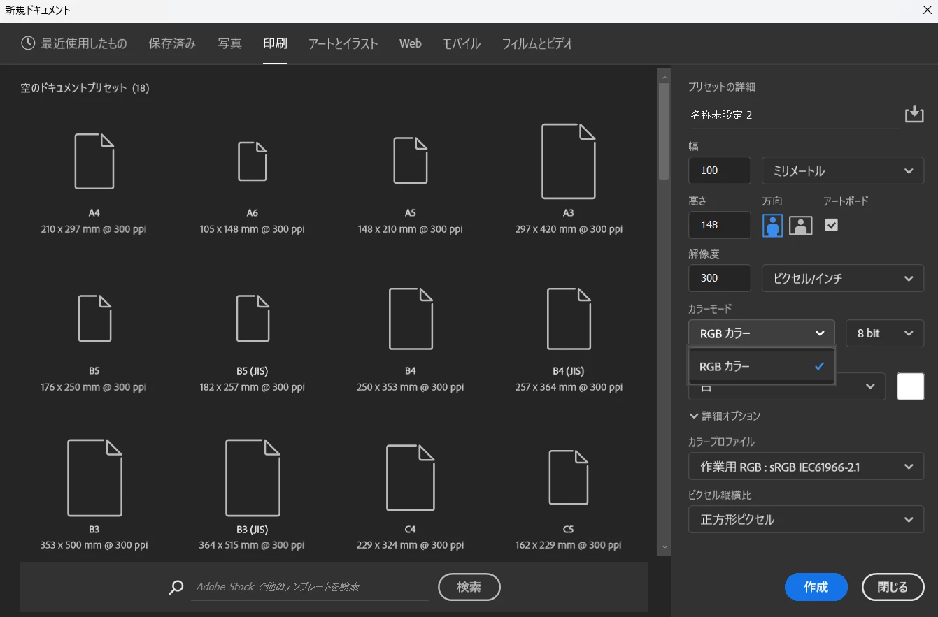 フライヤーのデザインを作成しようと思い印刷物のテンプレにてアートボードにチェックマークを入れたうえでCMYKカラーを選択しようとしたところ、RGBカラーしか選択肢がありませんでした。