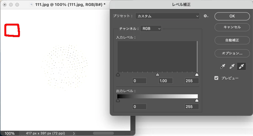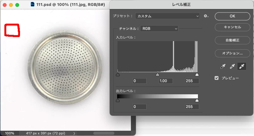 ちなみに上の写真の111.jpgのグレー部分をレベル補正・白スポイト1クリックで白くなった部分を