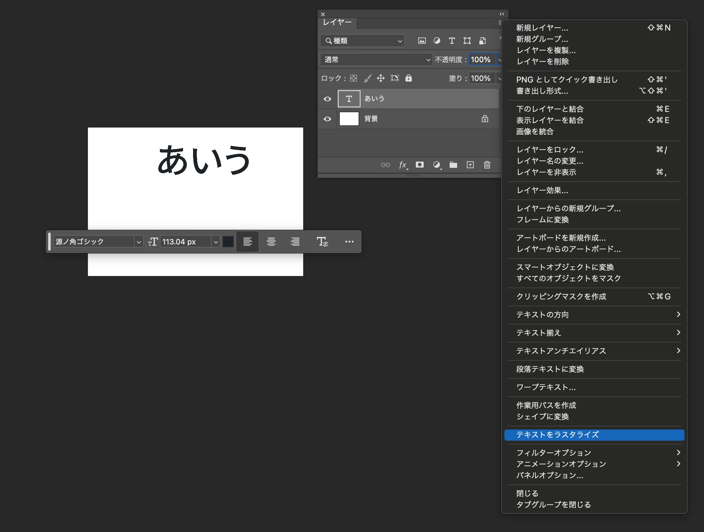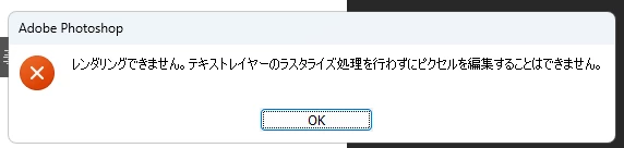 先にレイヤーパネルでテキストレイヤーをラスタライズしてください。
