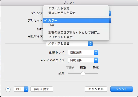 ・プリントダイアログの中の「プリント設定」で「プリセット」を「カラー」にする。