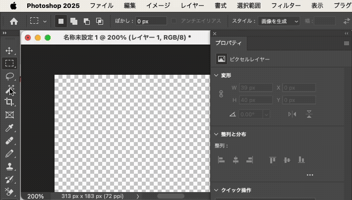 ぼかし設定があると、ドラッグ中に出るW/Hと確定後のプロパティパネル上のW/Hで値が異なることがわかります。