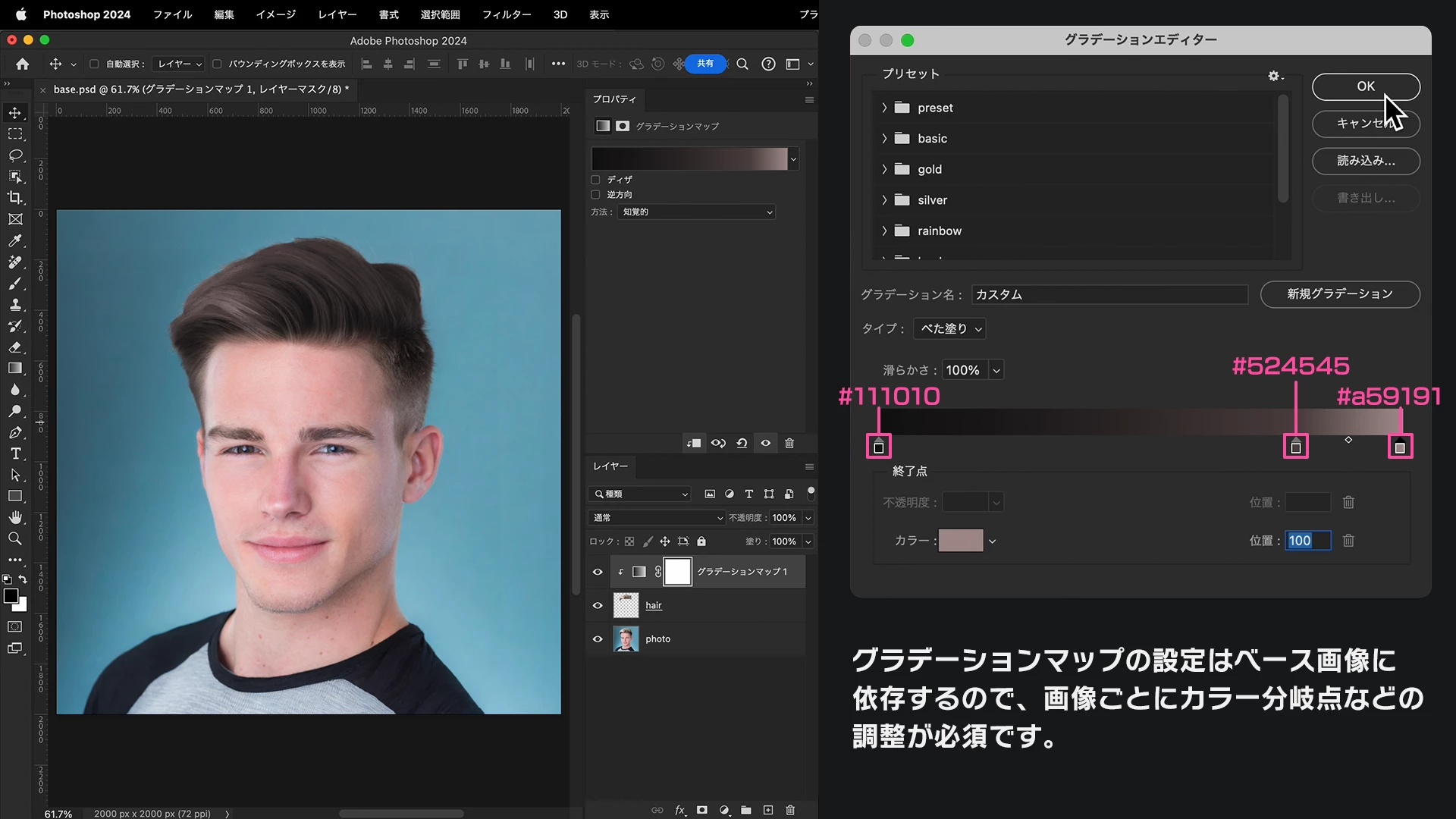 グラデーションマップは、明暗の階調に応じてカラーを適用する機能で複雑な色味の補正が可能です。