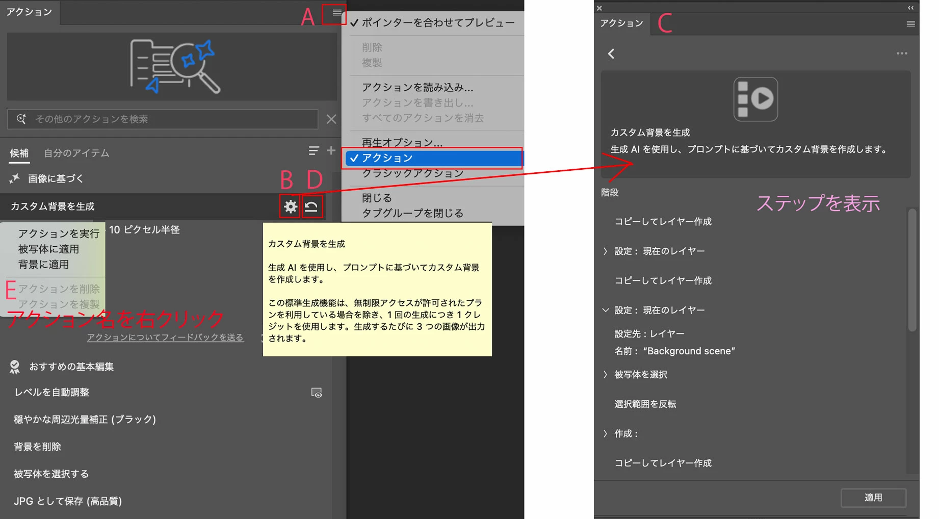 まずはアクションパネルの上図中Aで「アクション」を選択して新しいアクションUIを表示してください。
