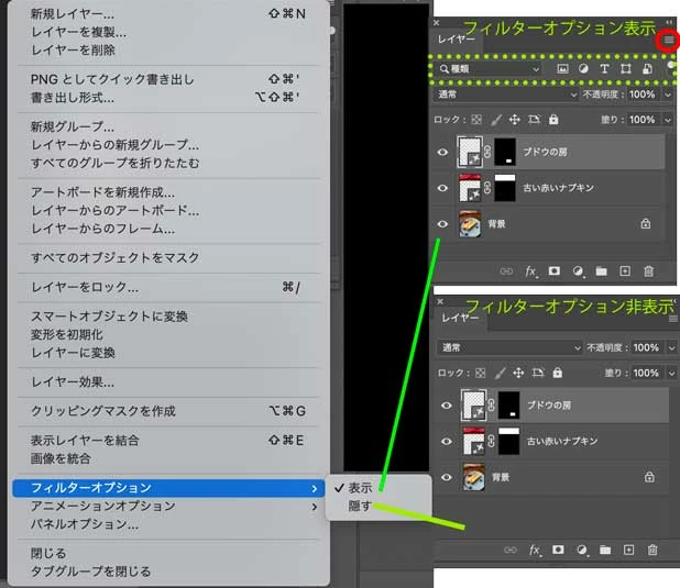 以前からあるこのフィルターオプションはレイヤーパネルをスッキリさせるためお使いいただいていると思います。レイヤーパネルのフライアウトメニュー(下図の赤丸の部分)からこのように「表示/隠す」が選べます。