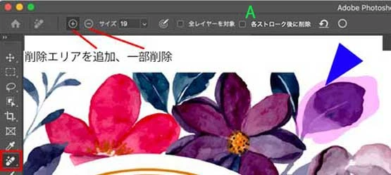 この機能を使うには削除ツールを選択時に上のオプションバーにある「各ストローク後に削除」(上図A)のボックスがオフになっていることが必要です。