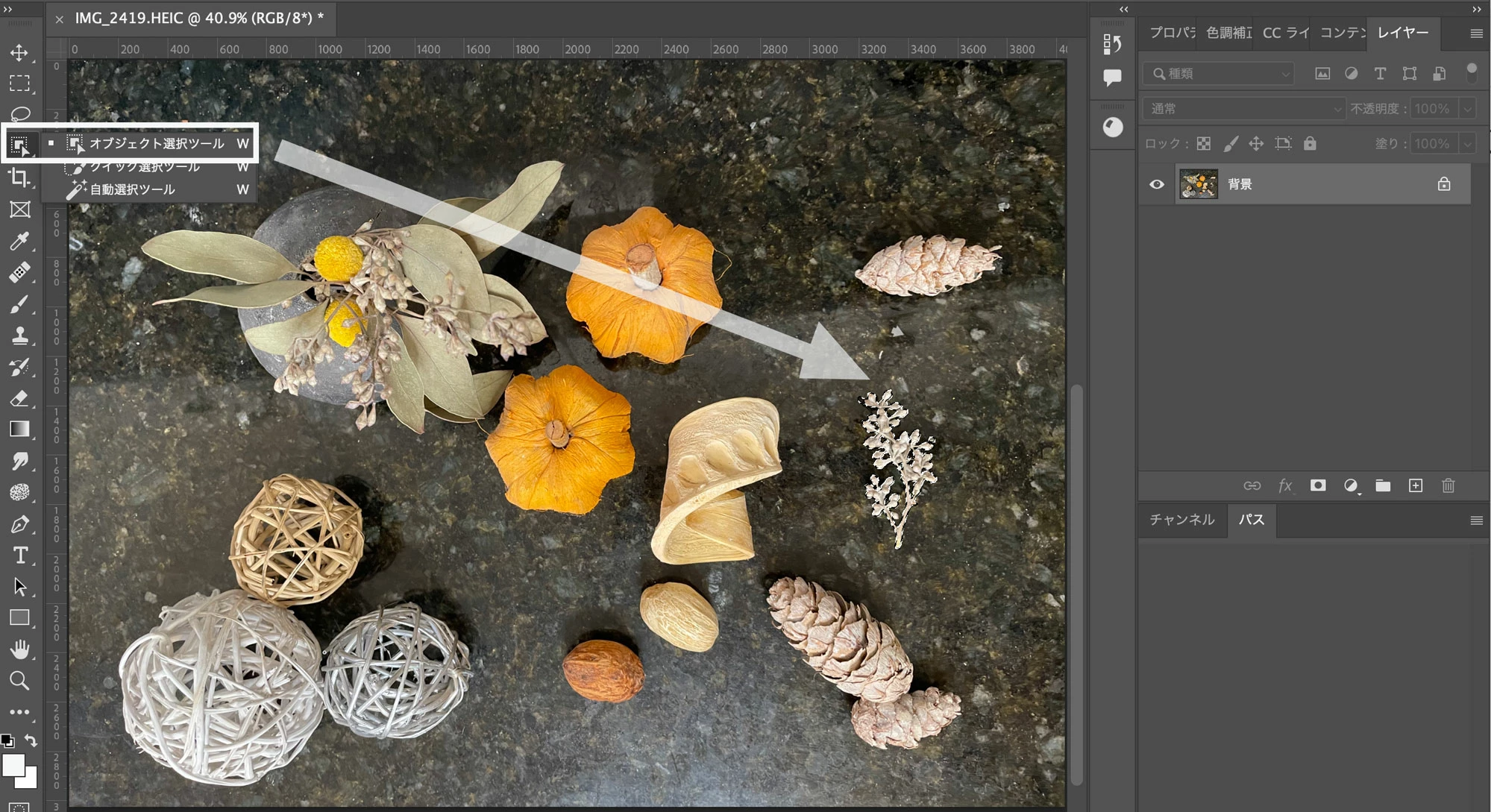 1. 「オブジェクト選択ツール」で選択範囲を作成します。