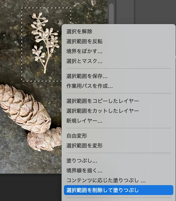 他の選択ツールを使用する場合は下図のように右クリックまたはCtrl+クリックで表示されるコンテクストメニューから「選択範囲を削除して塗りつぶし」を選びます。