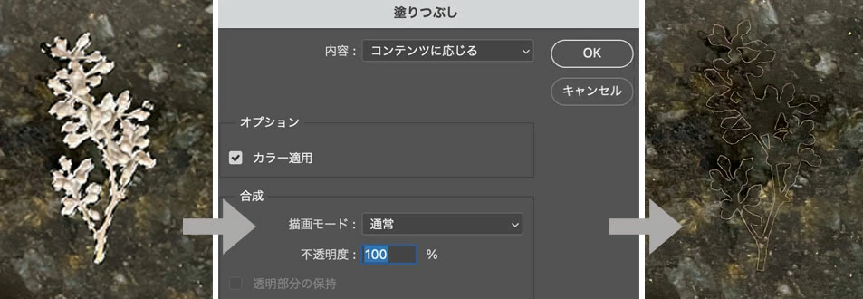 自動的に選択範囲が拡張され、コンテンツに応じた塗りつぶしが適応されています。ダイアログボックスを開くことなく、選択範囲の調整も大体の場合、必要ありません。