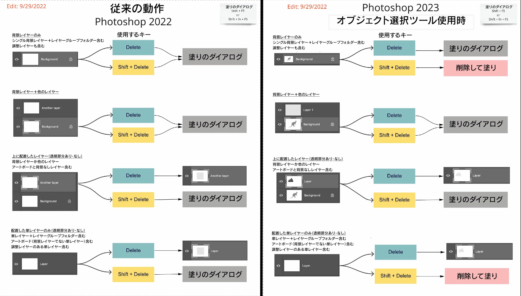 これはオブジェクトを消す時に作業時間を短縮をするために開発されました。以前はコンテンツに応じた塗りつぶしを使って削除する時にほとんどの場合選択範囲を広げて削除しなければいけませんでした。この新機能では選択範囲の拡張とコンテンツに応じた塗りつぶしを一度に行います。また、以前は「塗りつぶし」のダイアログが表示され、余計なステップがありましたがそれもなくなっています。