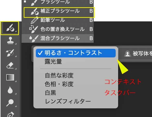 2.ブラシを選択したらコンテキストタスクバーから下図のように適用したい調整のタイプを選びます。ブラシサイズや硬さも設定できます。「被写体を選択」を選択すると被写体にその調整が適用されます。