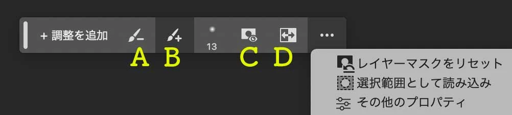 この新しい調整(補正)ブラシは画像をブラシでなぞって特定の部分だけを簡単に調整できる機能です。このブラシで行う調整はすべて非破壊編集なので元画像を変更することなく調整できます。使用すると自動的に新しいマスクレイヤーを画像の上に作るのでそれを非表示すれば元画像を見ることができます。調整(現在は下図のように「明るさ・コントラスト」をはじめとする6種類)はそれぞれデフォルト値で適用されますが、適用後にプロパティパネルで値をコントロールできます。