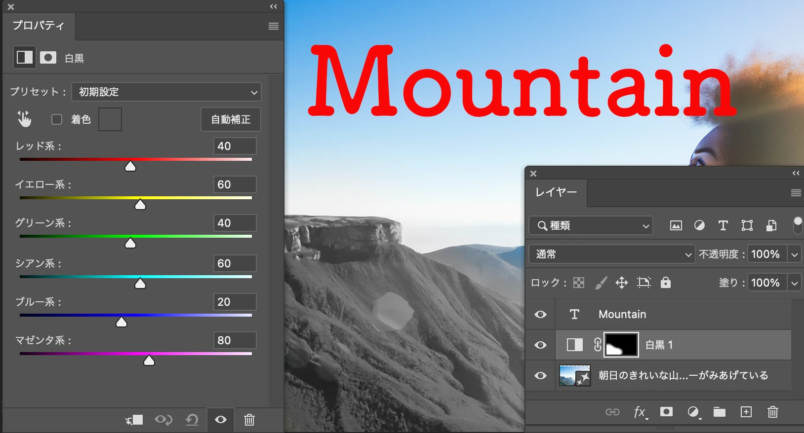 4.プロパティパネルでさらに微調整できます。(下図一番左)下記では調整の「白黒」を選択しブラシで山を塗りました。山だけ白黒になっているのがご覧いただけます。