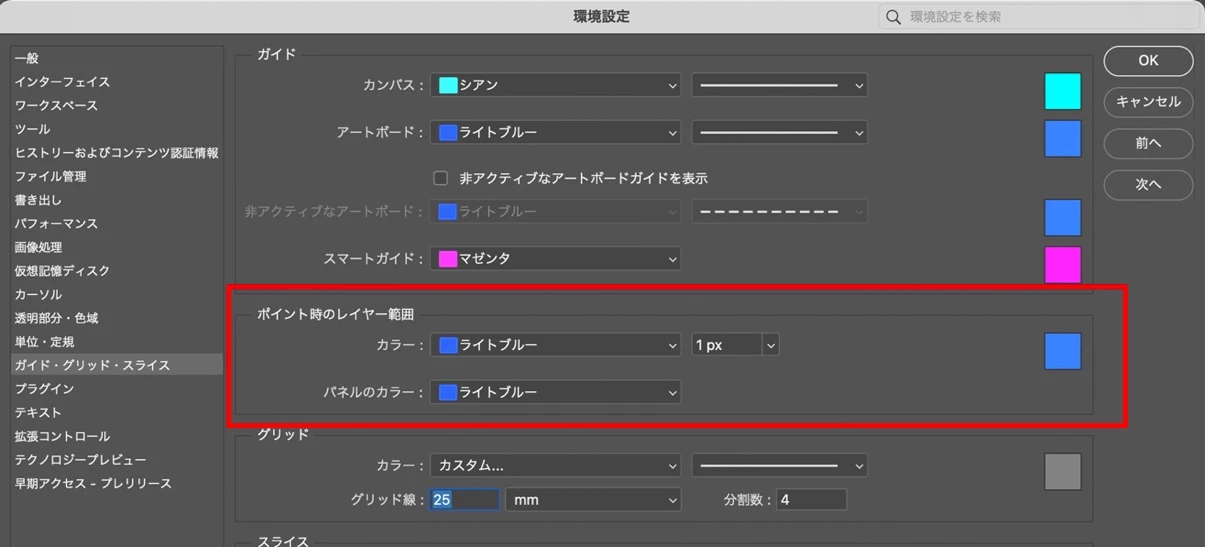 この機能に使用される境界線はカスタムが可能です。色、太さ、また該当するレイヤーをハイライトする色などをお好みで変えられます。環境設定(Cmd/Ctrl+Kキー、またはメニューのPhotoshop>設定)の「ガイド・グリッド・スライス」の下図の場所からアクセスできます。