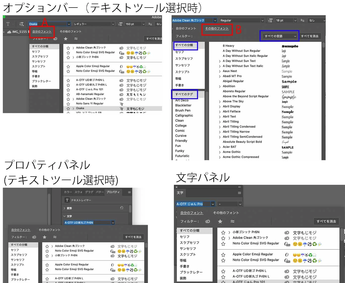 - 上記の向上はテキストツール選択時のオプションバー、プロパティパネル、または文字パネルでご覧になれます。場所は下図でご確認ください。