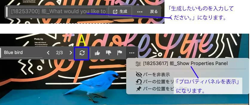 このビルドでは機能の安定性やパフォーマンスの向上、数々のバグ修正が行われています。また、生成塗りつぶしのUIの文言も更新中でこのビルドでは下図のようにまだローカライズできていないところがありますのでご了承ください。