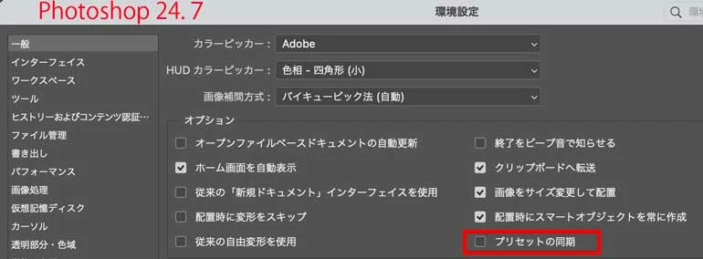 これをお使いかどうかは下図の環境設定>一般で「プリセットの同期」がオンになっているかで判断できます。オンになっている時は、プリセットはassets.adobe.comに保存され、さらにお使いのローカルディスクにも保存されます。これはPhotoshopが終了されるたびに行われます。下記の手順を踏めばプリセットをローカルディスクに保存、各デスクトップで「プリセットの同期」をオフ、assets.adobe.comからのプリセットを削除できます。