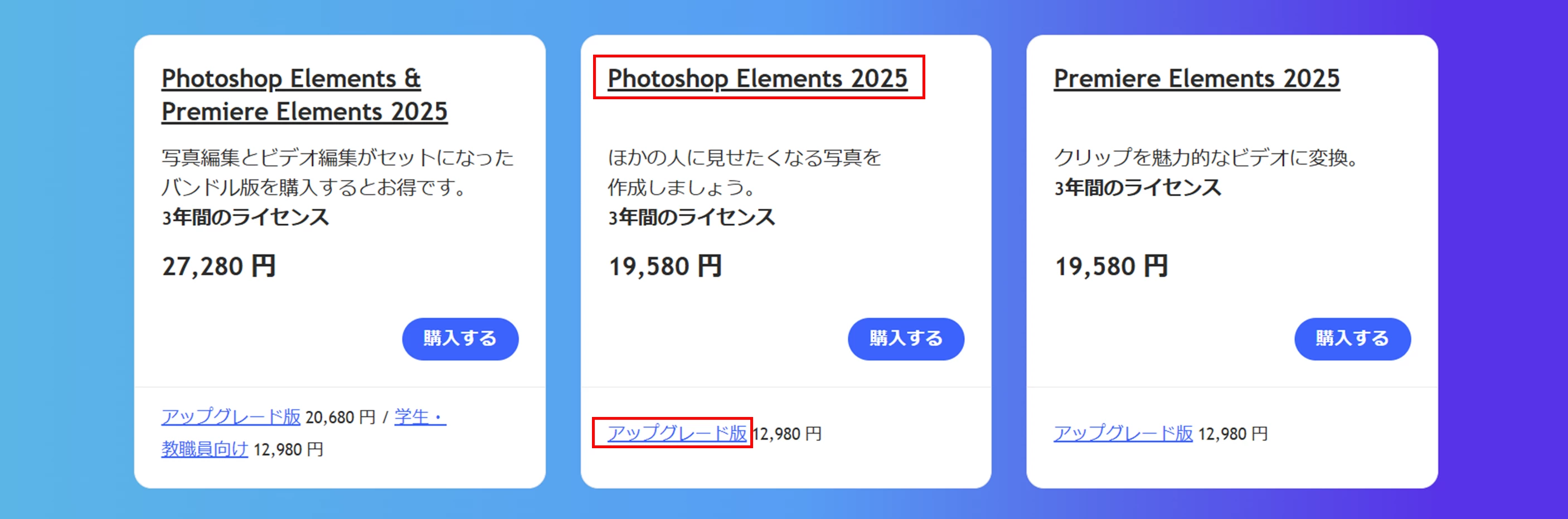 下記リンクのページの下部のほうに下図のような部分がありますので、そこの「アップグレード版」をクリックすると、購入ページに進みます。