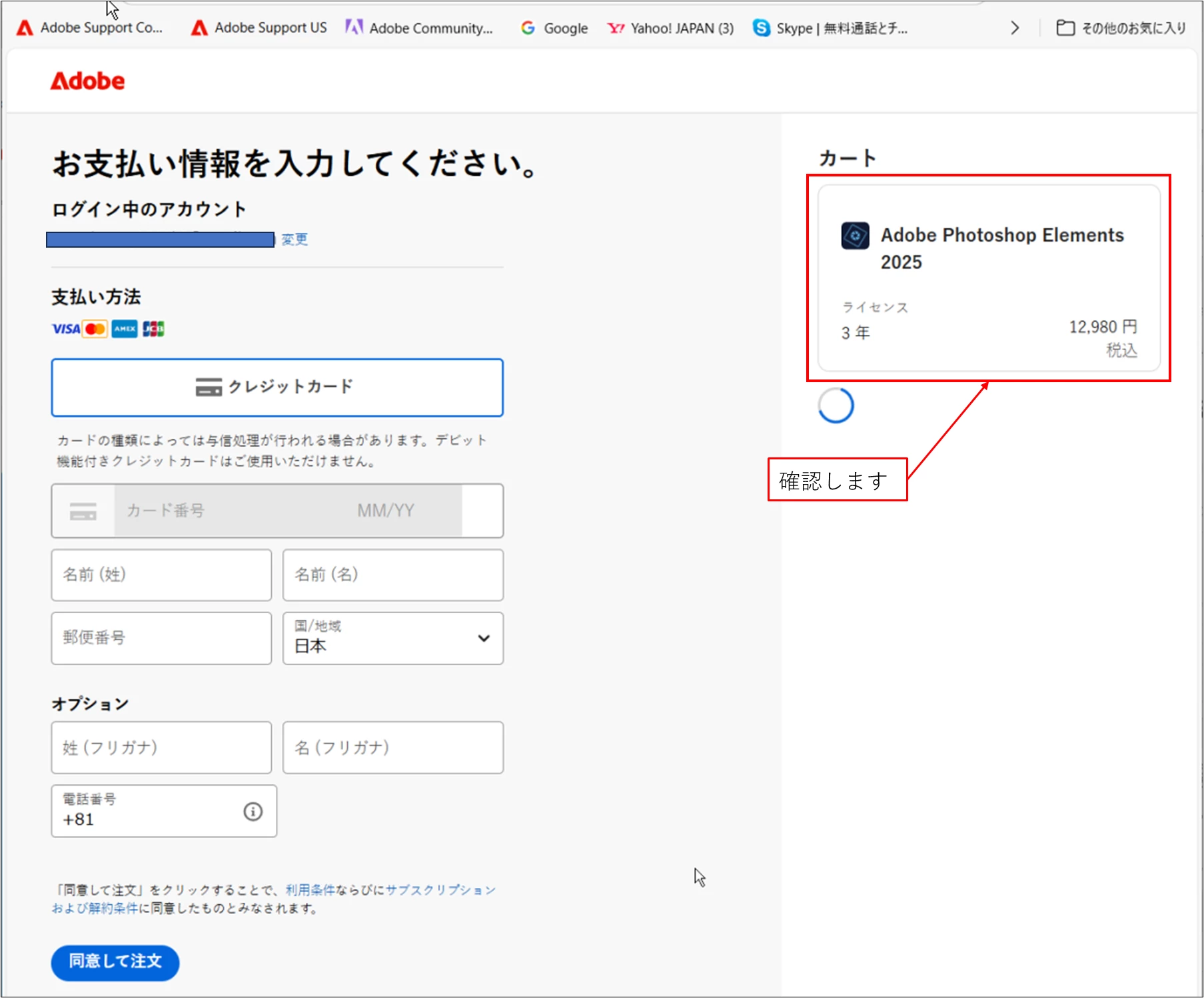 購入ページでカード情報を入力し、購入する製品を確認して「同意して注文」をクリックします。