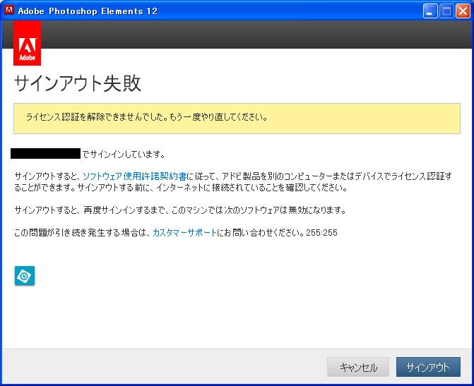 Photoshop Elements 12 でサインアウト失敗