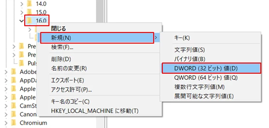 ④「15.0」バージョンのフォルダーの上で右クリックし、開いたコンテキストメニューから、「新規」→「DWORD(32ビット)値」を選択します。