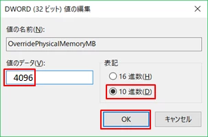 数値は、PCに搭載されているメモリー量(GB)に1024を乗じた数で、4GBなら「4096」、8GBなら「8192」、12GBなら「12288」、16GBなら「16384」、32GBなら「32768」です。