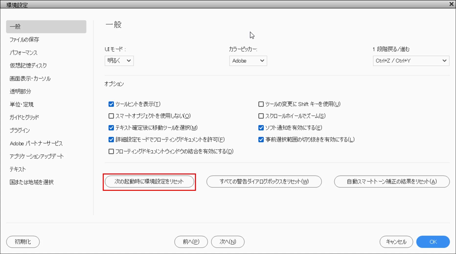 メニューの「編集」→「環境設定」→「一般」を選択し、開いた「環境設定」ウィンドウで、「次の起動時に環境設定をリセット」(下図赤枠部)をクリックし、最後に「OK」をクリックします。