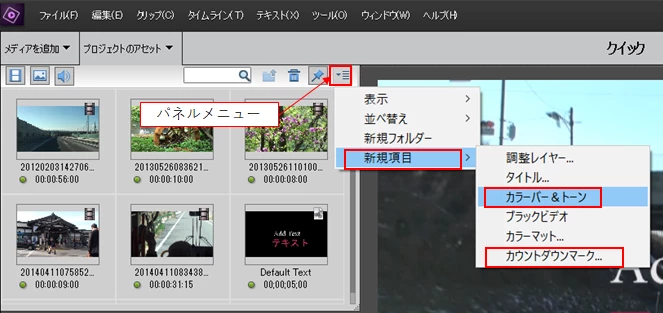 もし、Premiere Elementsの場合でしたら、「プロジェクトのアセット」のパネルメニューを開き、「新規項目」→「カラーバー&トーン」または「カウントダウンメニュー」を選択すれば、作成することが出来ます(下図)。
