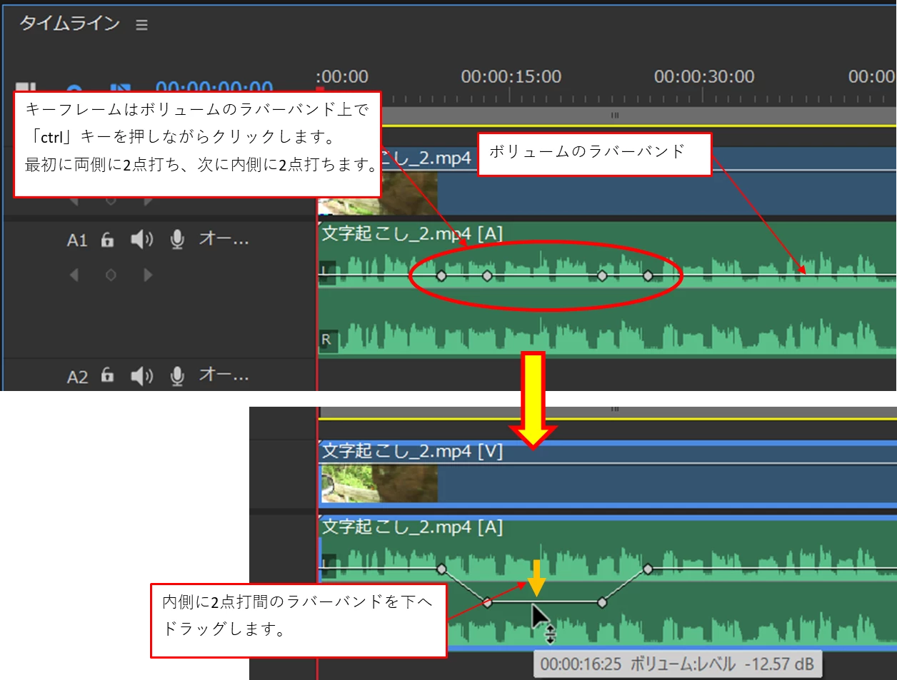 撮影したビデオの音声を部分的に下げたいのですが、キーフレームの追加方法が分かりません。詳しい方に教えていただけると助かります。(10年以上前からPremiere Elementsを使ってきましたが、PC不調のため買い換え、それに伴ってPremiere Elementsも2025に更新しました。2025はかなり画面が変わっており困惑しています)