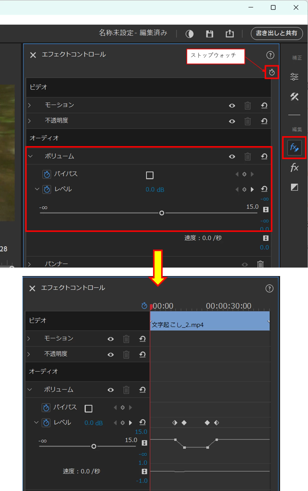 ①右端の「fx+鉛筆」アイコンをクリックし、「エフェクトコントロール」パネルを開き「」「オーディオ」の「ボリューム」を展開します。